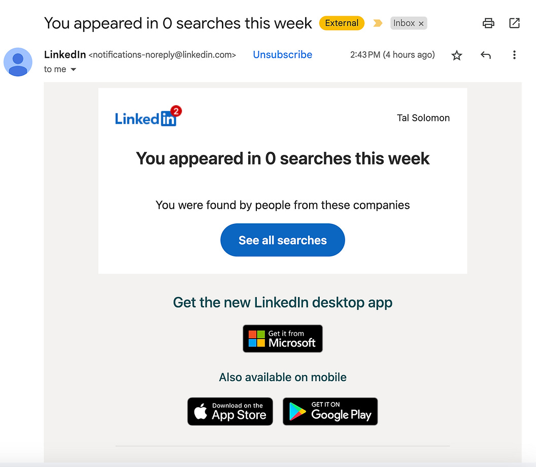 מדובר על חשבון המקושר לאימייל עבודה שלי איתו אני מגייס מועמדיםות לצוות שלי. זהו פרופיל ״חסוי״ שאין לא.נשים רצון או סיבה לצפות בו. הוא אפילו לא מפרט יותר מדי עלי, בניגוד לפרופיל לינקדאין הרגיל שלי כמובן. אז אתםן ודאי יכוליםות להבין מדוע היה זה מוזר שלינקדאין טרחו להודיע לי שהפרופיל שלי לא מקבל צפיות, כמו גם העובדה שהציגו את פריט המידע הזה בצורה שמילולית תואמת למצב אחר, טמפלטאי, שאמור להכיל מספרים חיוביים, גם אם בודדים.