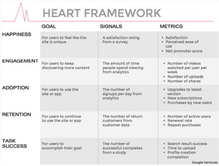 HEART הם ראשי התיבות של Happiness, Engagement, Adoption, Retention ו- Task Success. אלו, לפי היוצרים, הקטגוריות המרכזיות שצוות ה- UX מבקש למדוד בכל פרויקט UX, ולפיכך אלו הם הגורמים הישירים להפקת הערך עבור המשתמשים.
