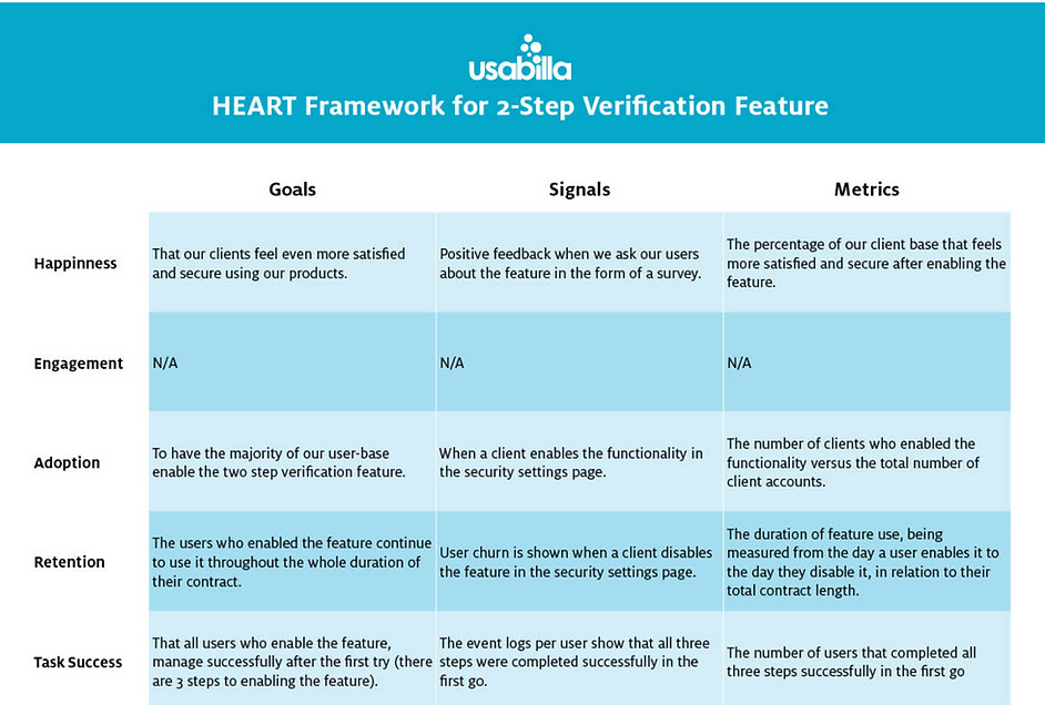 אוקיי, אבל איך אנחנו מודדים כל קטגוריה דה-פקטו? אז החבר’ה בגוגל הוסיפו את הציר השני (GSM) המורכב מ- Goals, Signals ו- Metrics. ההנחה מאחוריו היא שאופן מדידת הקטגוריות בציר ה- HEART תלוי בפרויקט ובמטרותיו, ולכן יש צורך בתהליך אופרציונלי (שלקוח מעולם הסטטיסטיקה) שמתחיל במטרה הנגזרת לכדי משתנה תיאורטי שהופך בסופו של דבר למשתנה אופרציונלי (קרי, מדיד).